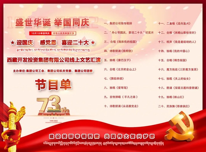 為迎接黨的二十大勝利召開,以良好的精神風(fēng)貌向祖國(guó)73周年華誕獻(xiàn)禮,9月30日,西藏開投集團(tuán)舉辦“迎國(guó)慶、感黨恩、喜迎二十大”主題線上職工文藝晚會(huì)。集團(tuán)公司黨委書記、董事長(zhǎng)祁騰武出席活動(dòng)并致辭。集團(tuán)公司領(lǐng)導(dǎo)班子成員劉剛、陳焱罡、羅布次仁、溫勇、鄧強(qiáng)、尼瑪出席活動(dòng)。