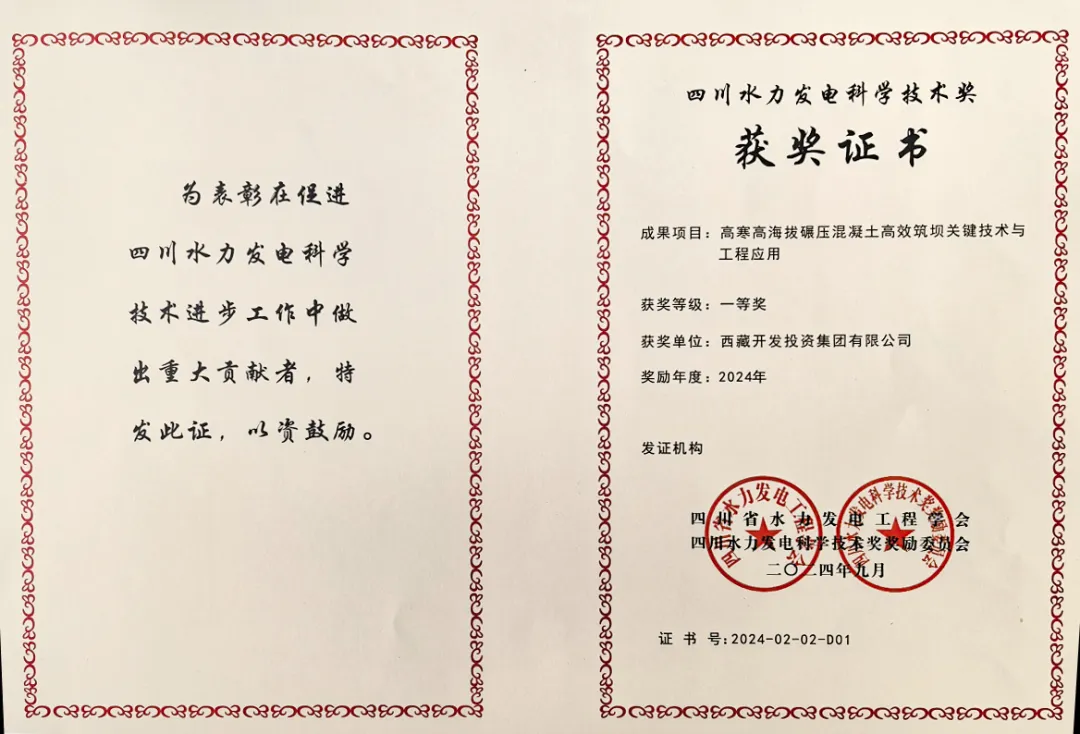 9月25日,四川省水力發(fā)電工程學(xué)會(huì)2024年度學(xué)術(shù)年會(huì)在成都召開(kāi),并舉辦2024年四川水力發(fā)電科學(xué)技術(shù)獎(jiǎng)?lì)C獎(jiǎng)典禮,西藏開(kāi)投集團(tuán)果多水電站創(chuàng)新成果“高寒高海拔碾壓混凝土高效筑壩關(guān)鍵技術(shù)與工程應(yīng)用”榮獲四川水力發(fā)電科學(xué)技術(shù)獎(jiǎng)一等獎(jiǎng)。