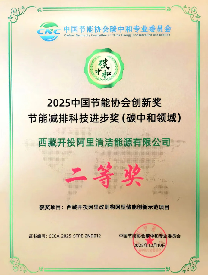 近日,由中國質(zhì)量認證中心、中國節(jié)能協(xié)會碳中和專業(yè)委員會聯(lián)合頒發(fā)的2025中國節(jié)能協(xié)會創(chuàng)新獎名單揭曉,由西藏開投阿里清潔能源公司投資建設(shè)的阿里改則構(gòu)網(wǎng)型儲能創(chuàng)新示范項目獲“節(jié)能減排科技進步獎(碳中和領(lǐng)域)二等獎”。