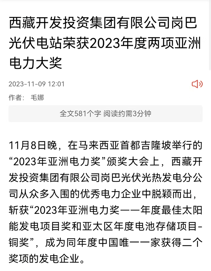 科技日報、西藏日報、西藏日報客戶端等多個媒體報道了《西藏開發(fā)投資集團有限公司崗巴光伏電站榮獲2023年度兩項亞洲電力大獎》