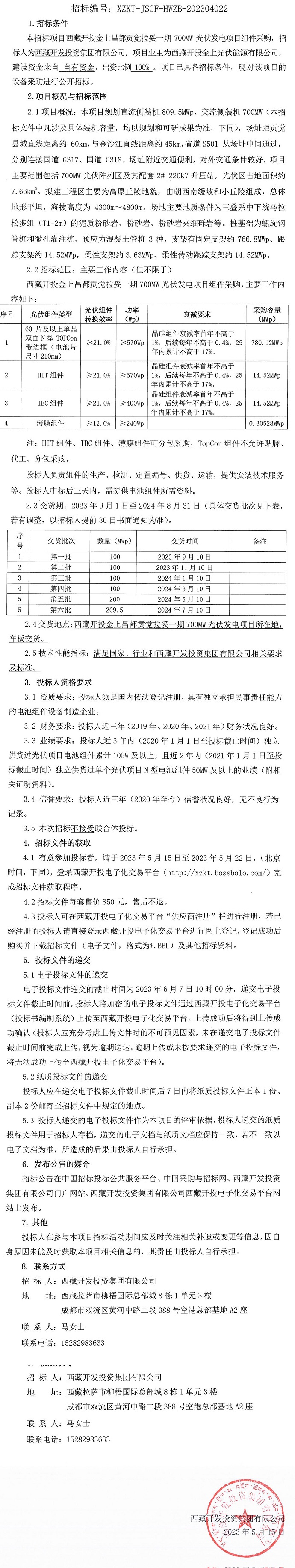 西藏開投金上昌都貢覺拉妥一期700MW光伏發(fā)電項(xiàng)目組件采購招標(biāo)公告