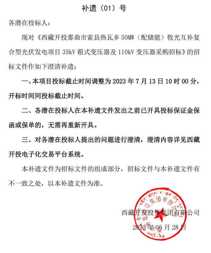 西藏開投那曲市索縣熱瓦鄉(xiāng)50MW(配儲能)牧光互補復合型光伏發(fā)電項目35kV箱式變壓器及110kV變壓器采購招標