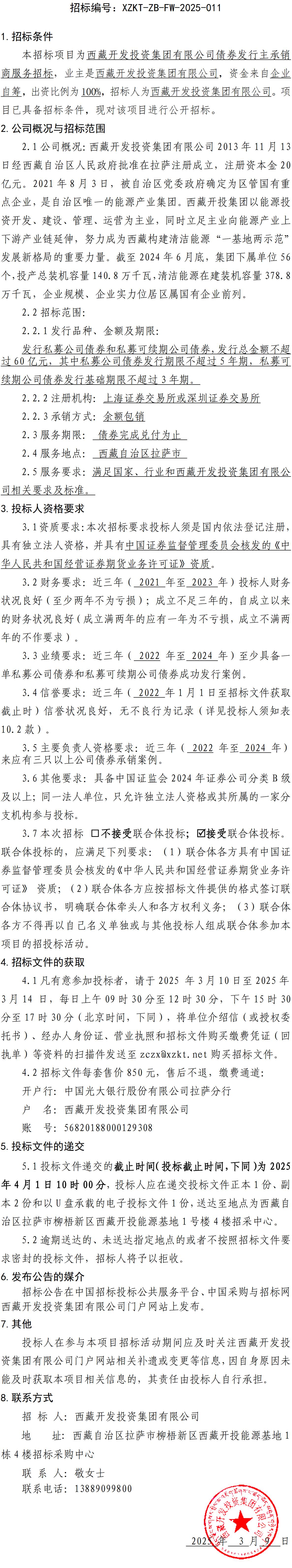 西藏開(kāi)發(fā)投資集團(tuán)有限公司債券發(fā)行主承銷(xiāo)商服務(wù)招標(biāo)公告